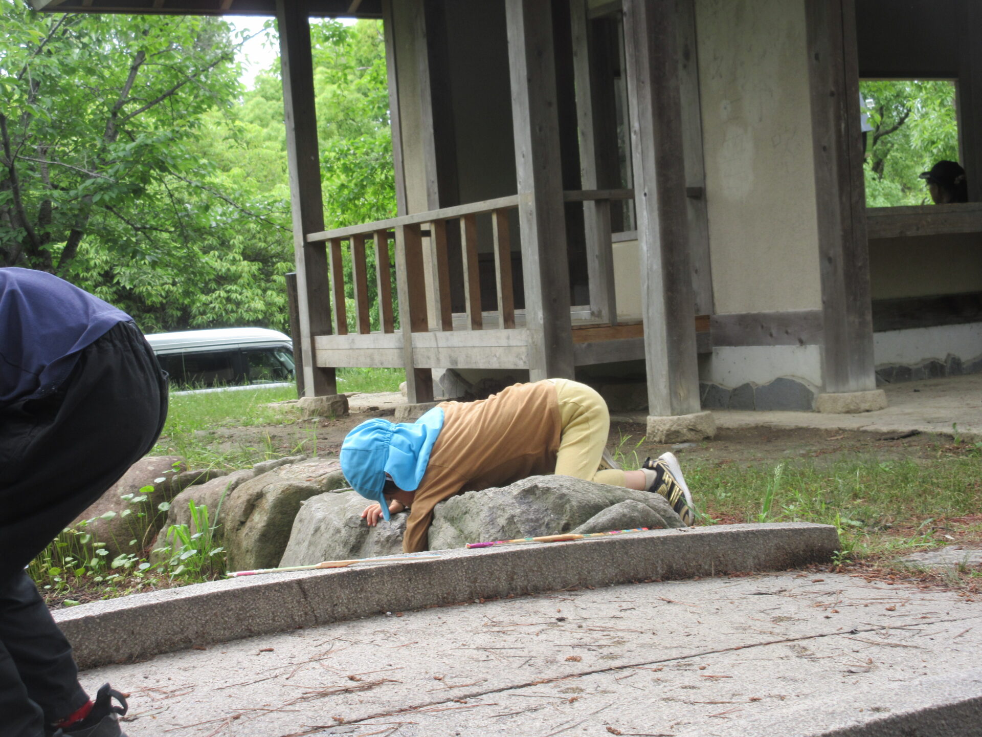 先生が岩場の下に