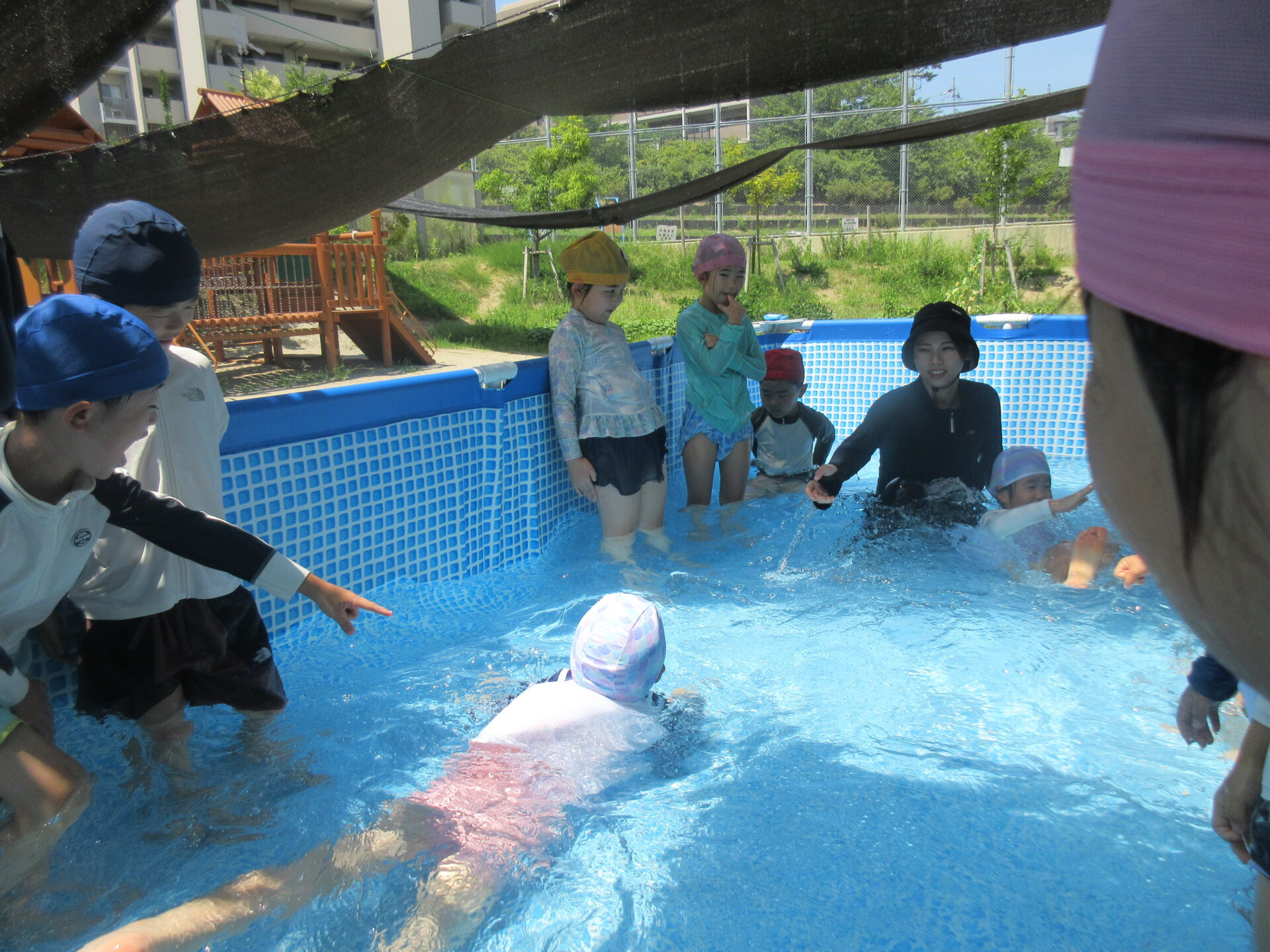 にじ組がプールの間に