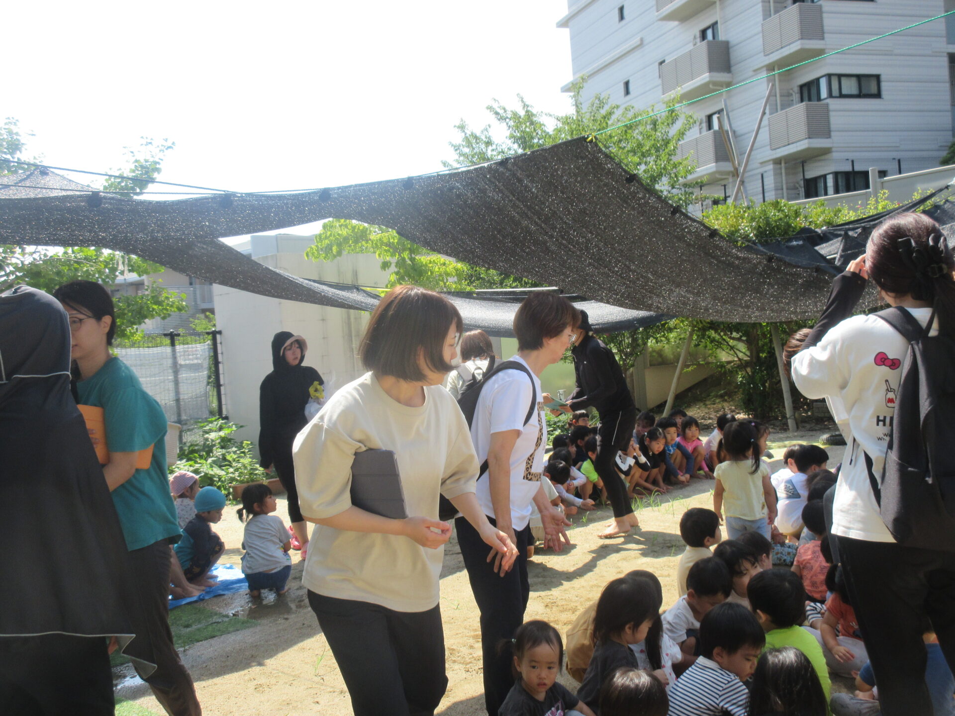 暑いので日陰を譲り合って