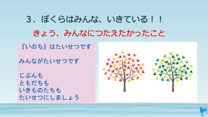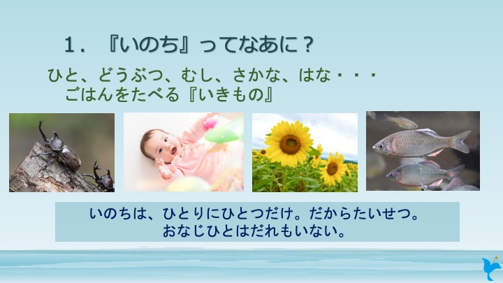 私は毎年5歳児さんにこの話をしていますが、今年の5歳児さんたちは「石や水にも命がある」という子が例年より多かったです。