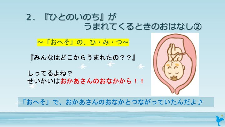 「みんなのおへそって何のためにあるか知ってる?」と聞くと、兄弟の多いお友達がよく知っていて、「お母さんのお腹とつながっててご飯もらってた」と話してくれました。