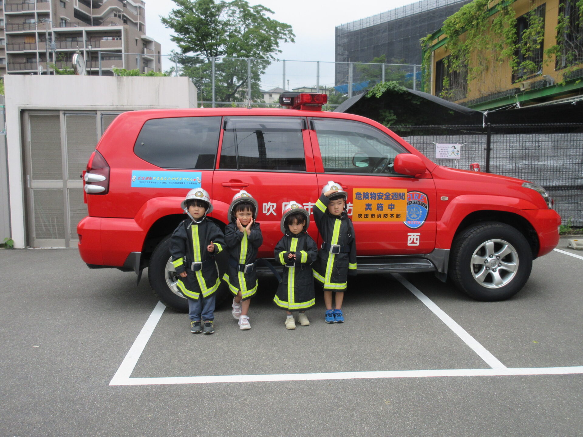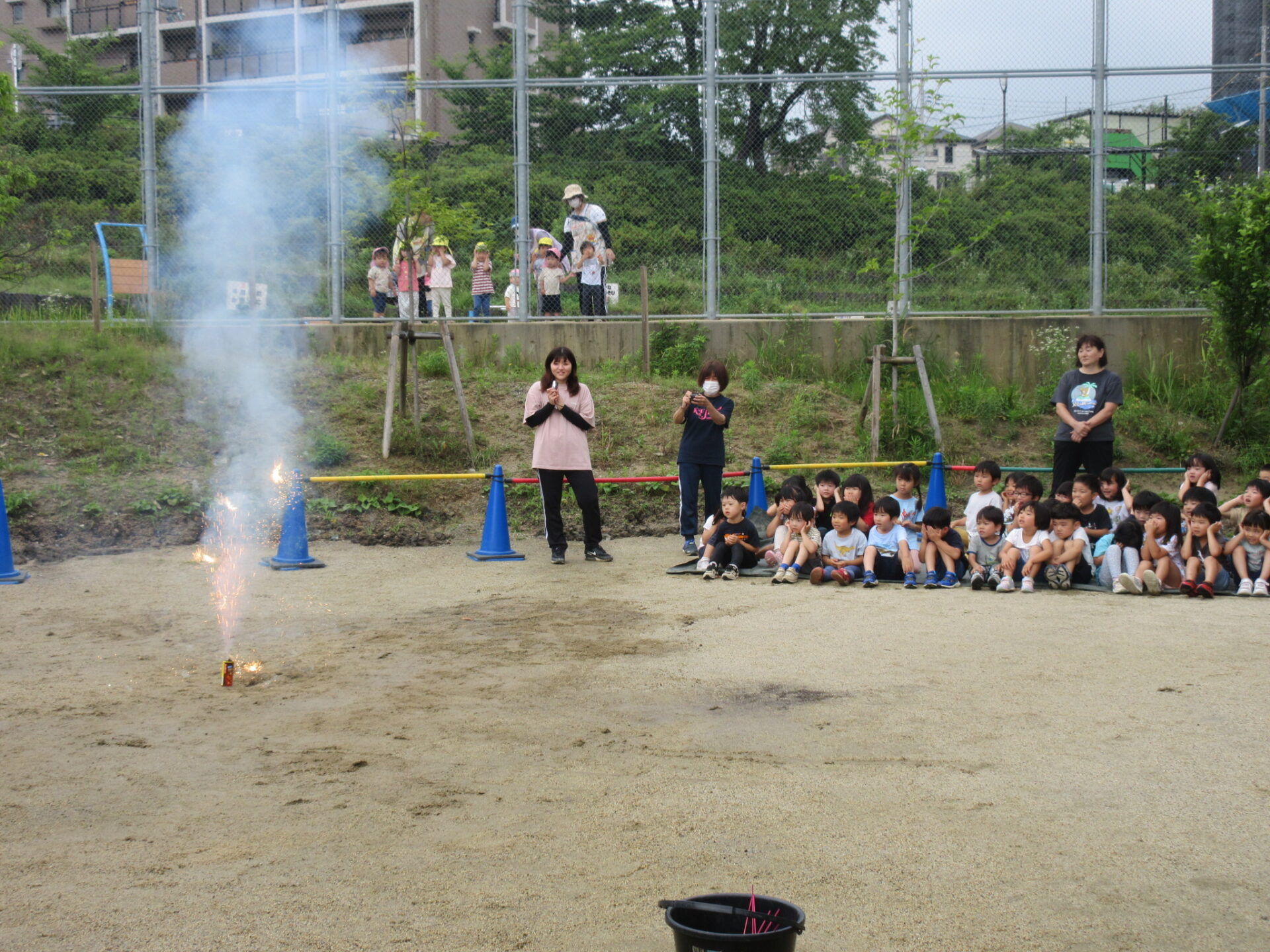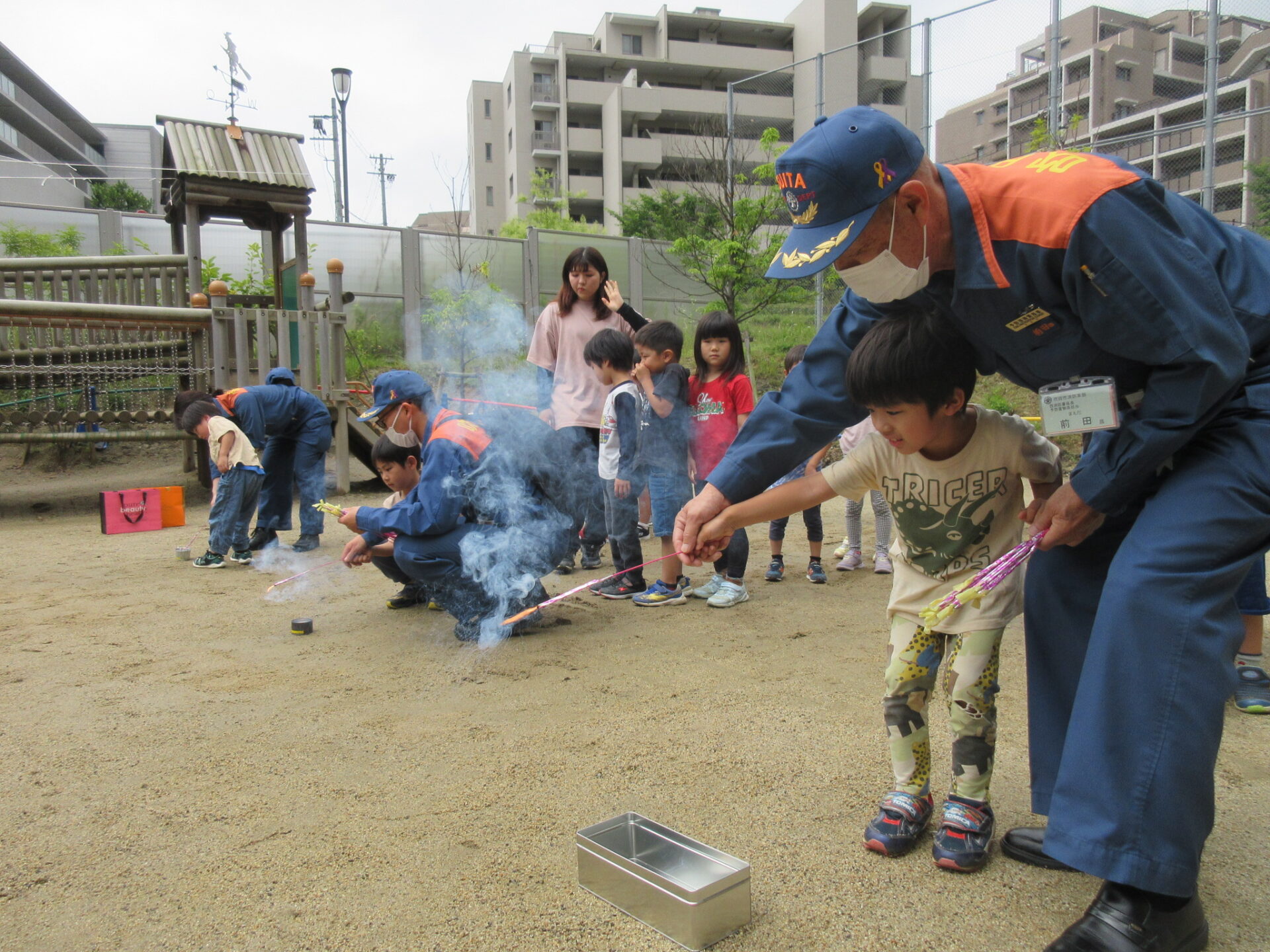 吹田市消防署員の方に来園いただき、これから夏にかけて遊ぶことも多くなる花火体験教室を行ってもらいました。はじめに消防士さんから「花火は、ひとりでやらずに必ず大人の人とやってね」「花火は人に向けたり燃えるものに向けたら危なです。燃えるものがないところと下に向けてやってね」「終わった花火は必ず水に浸けて火を消してね」といったことを聞きました。その様子は真剣でした。
