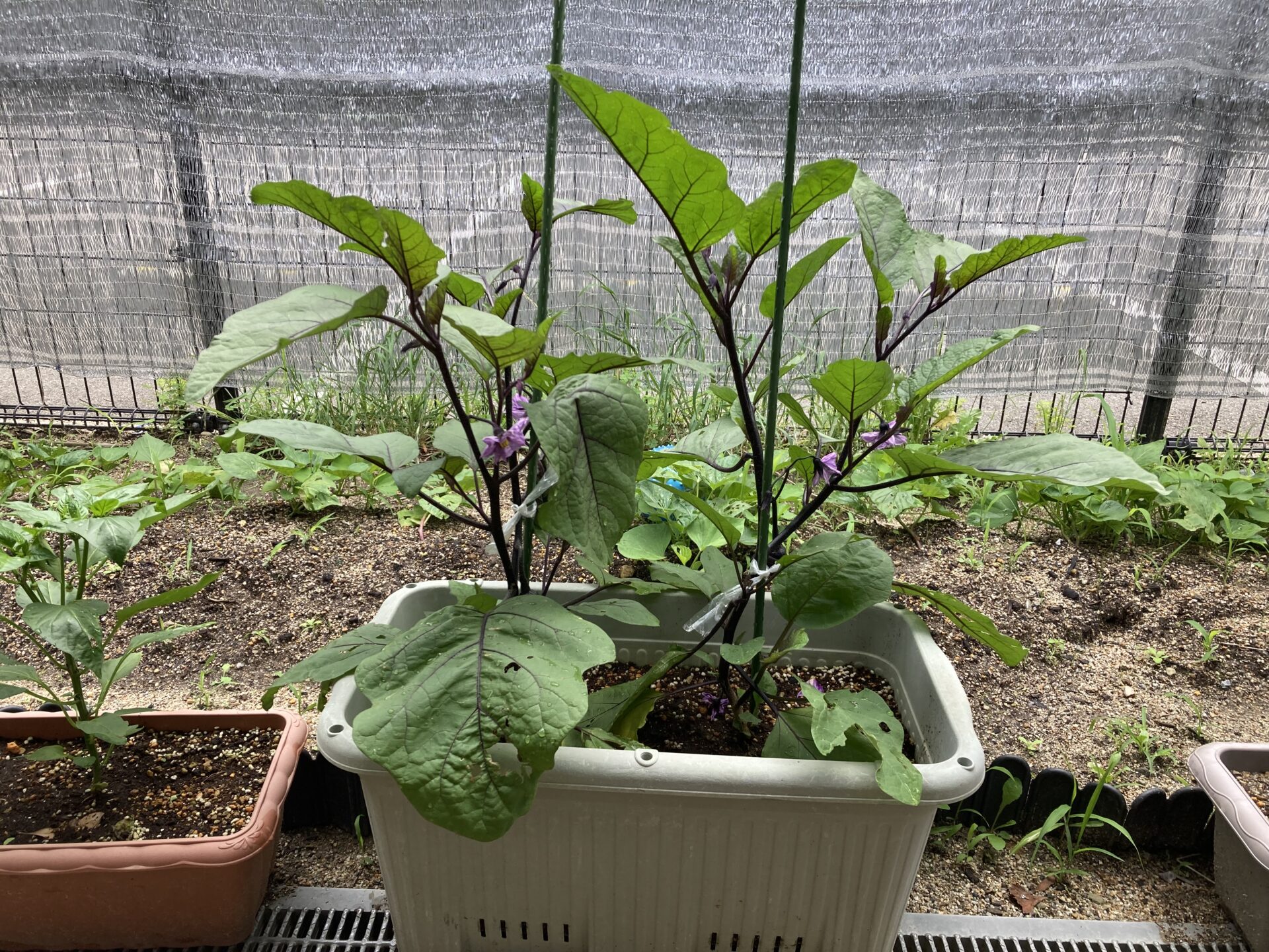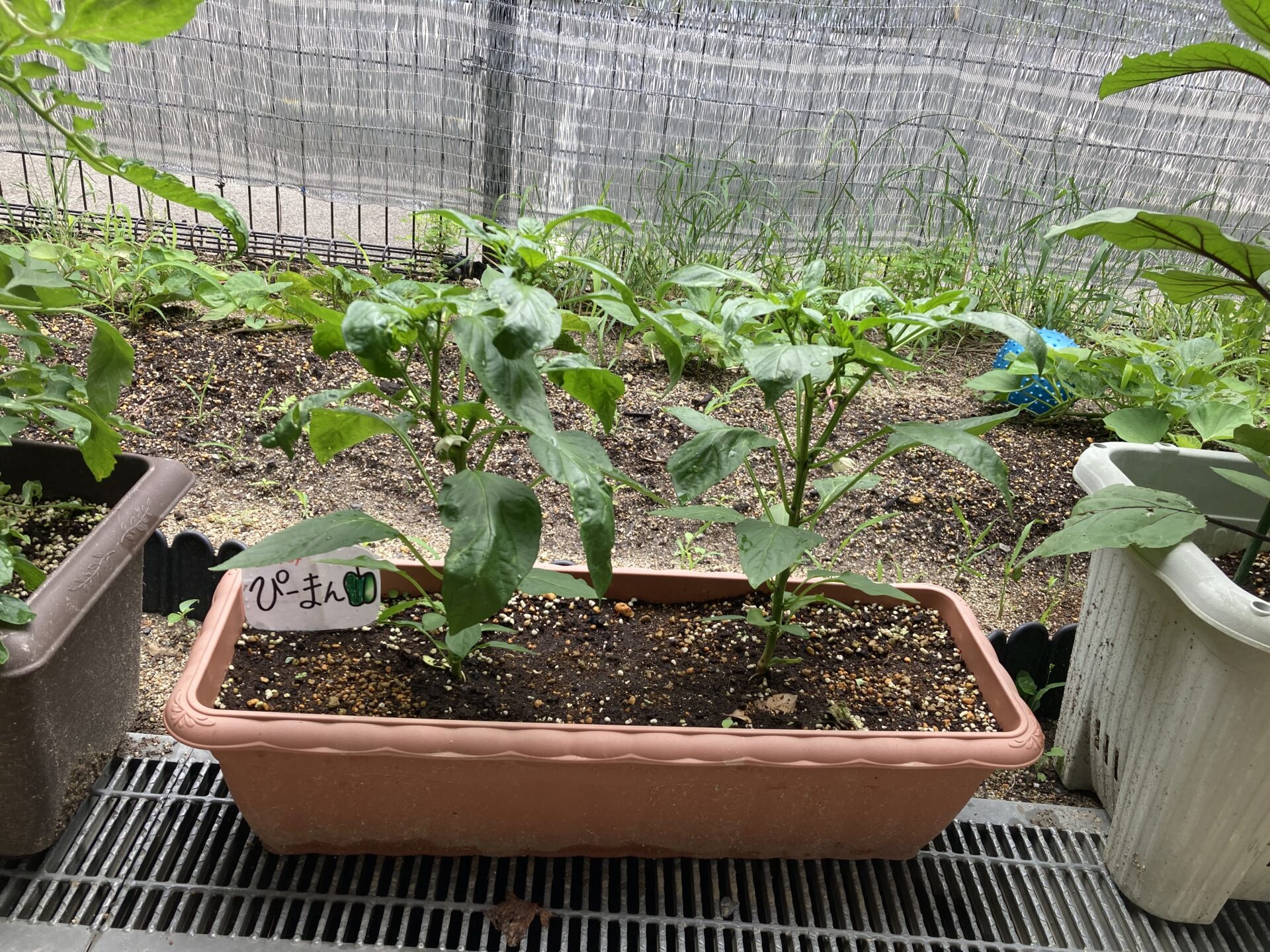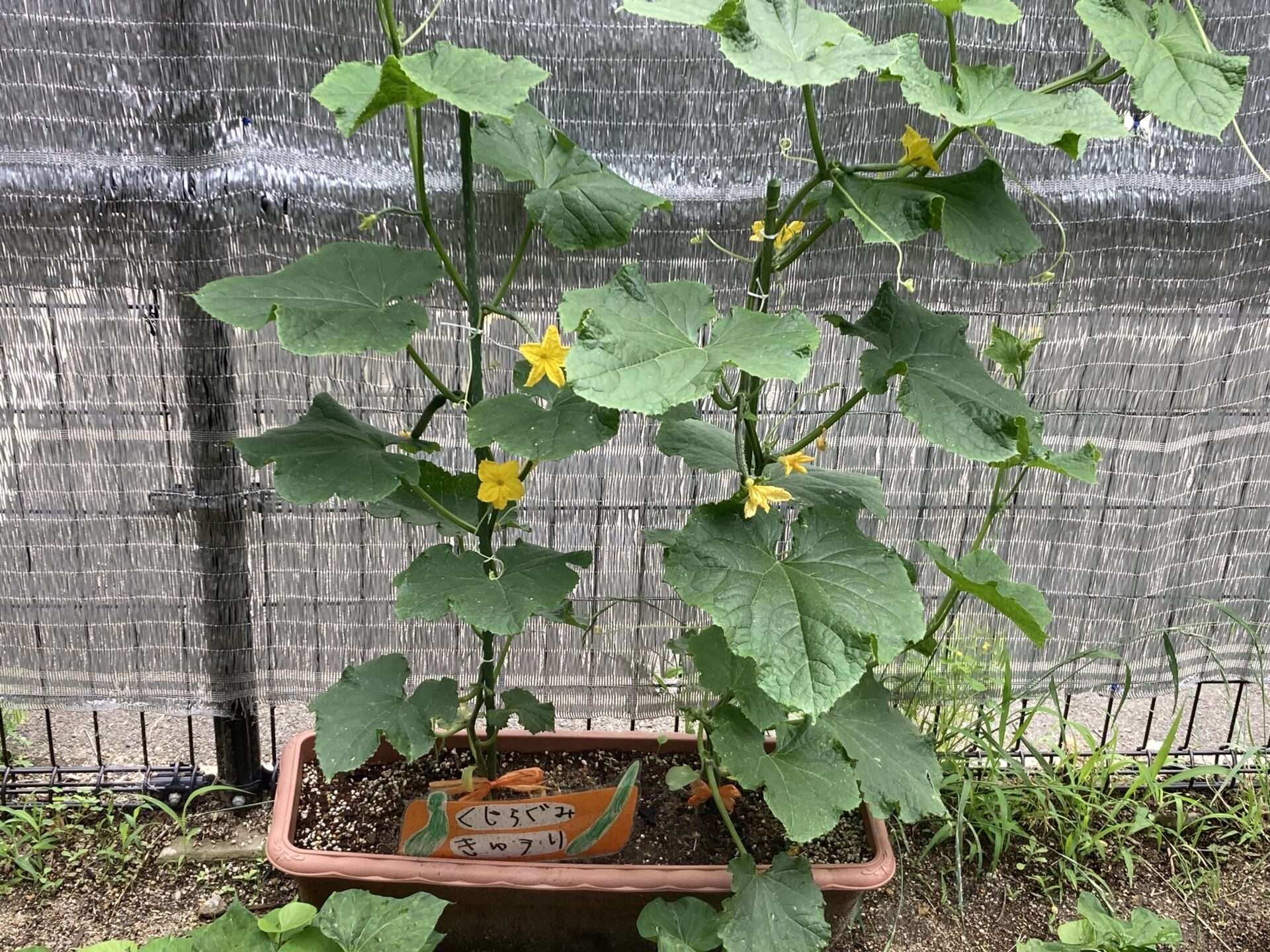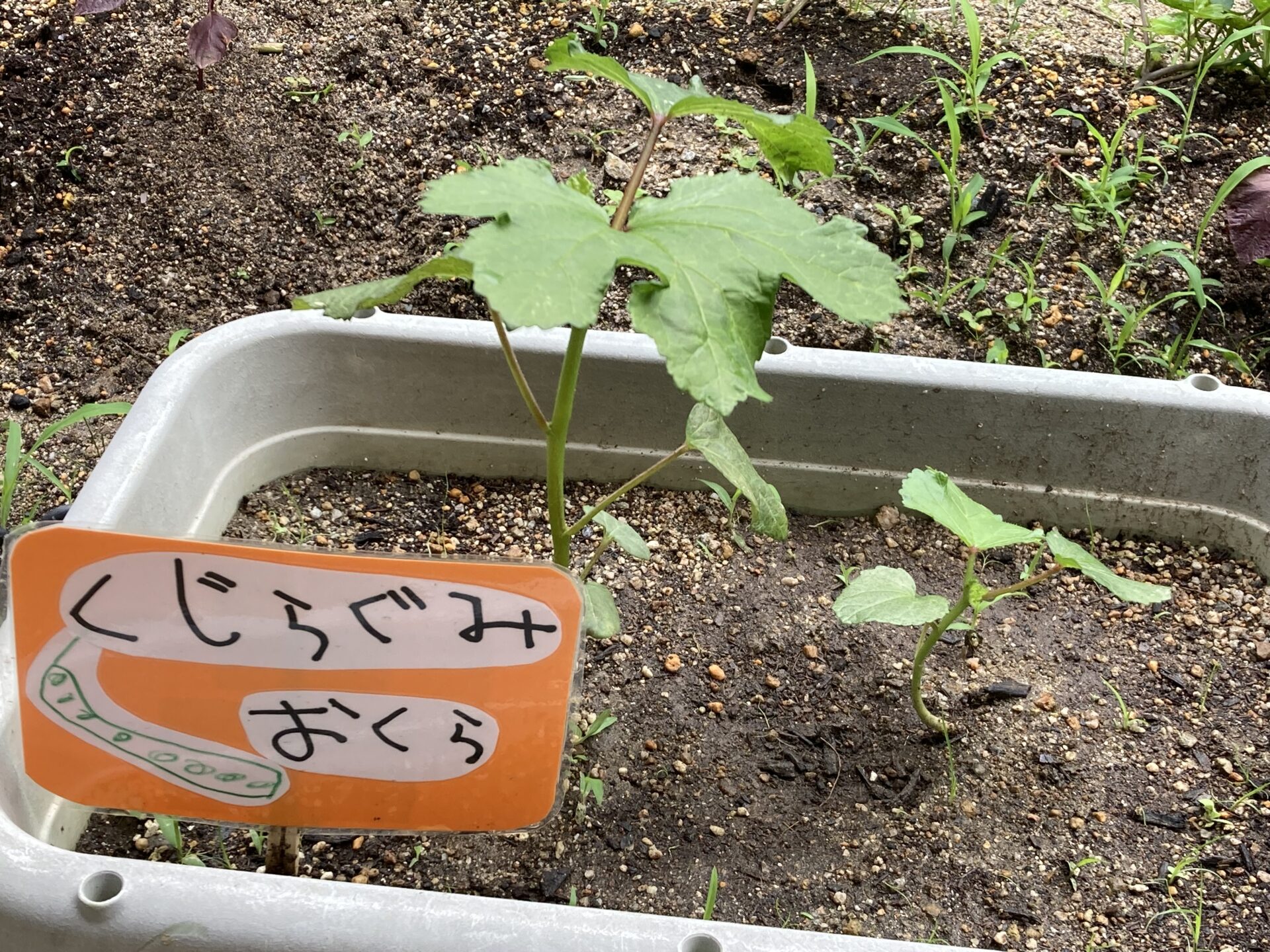 園庭の一部やプランターを使って夏野菜を育てていますが、ここ数日の雨のおかげか、急に大きくなってきています。いろんな種類を植えていて、園児も成長を観察しています。