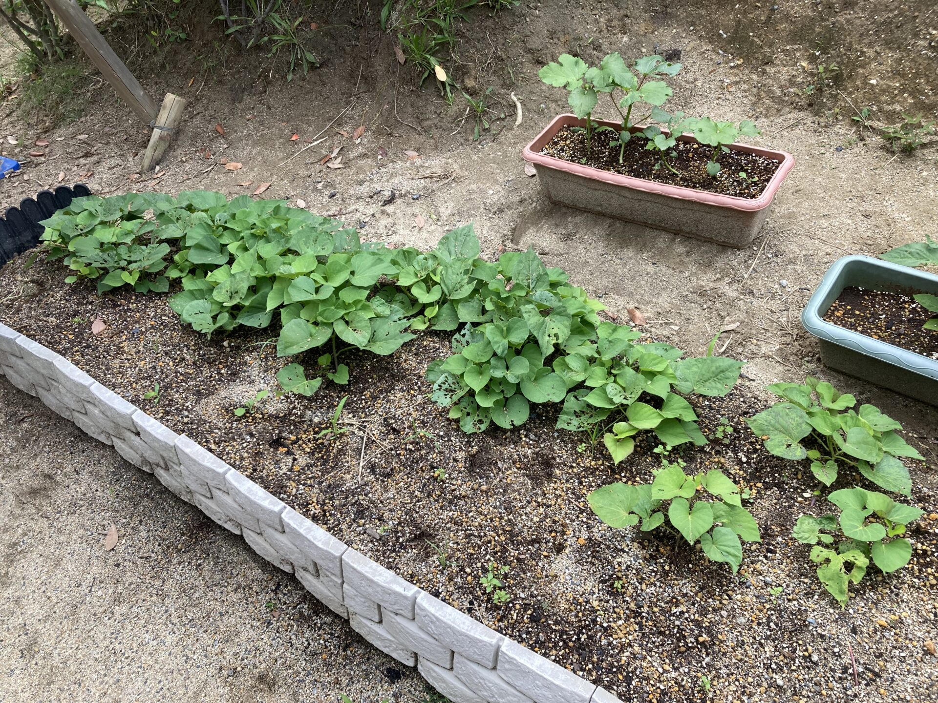 早いものだと、そろそろ収穫できそうな野菜もあります。園児たちには自分たちで育てた野菜を収穫する経験と、給食の先生に頼んで調理してもらって食することで食物のありがたさを感じてほしいと思っています。そして順調にいけば今年も秋には園庭での「いもほり大会」が出来そうです。今から楽しみです!