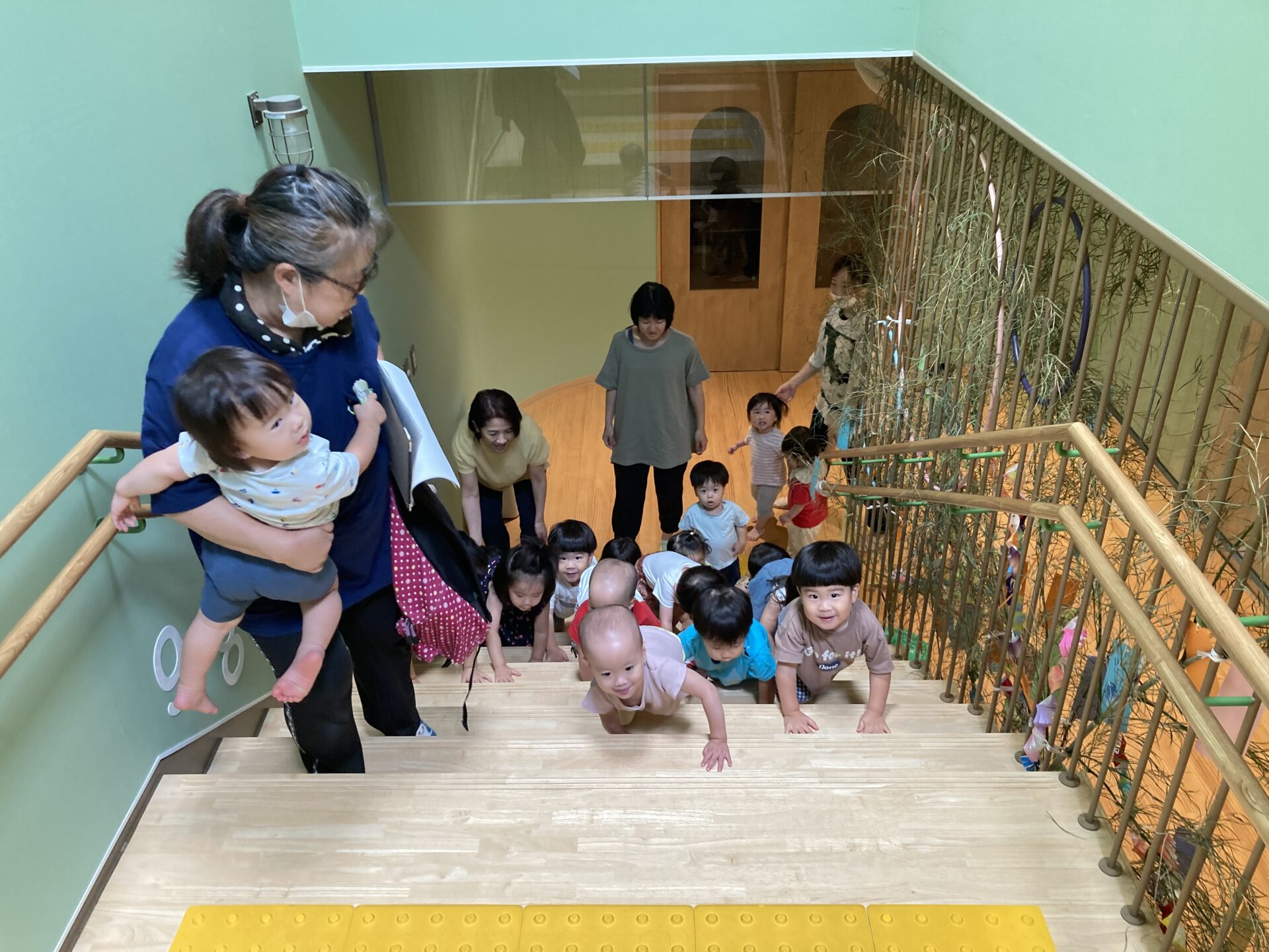 洪水が起きた時、園で非難する場合は高い所へ避難する約束です。だいち組(1歳児)は一生懸命階段を登って2階まで避難します。