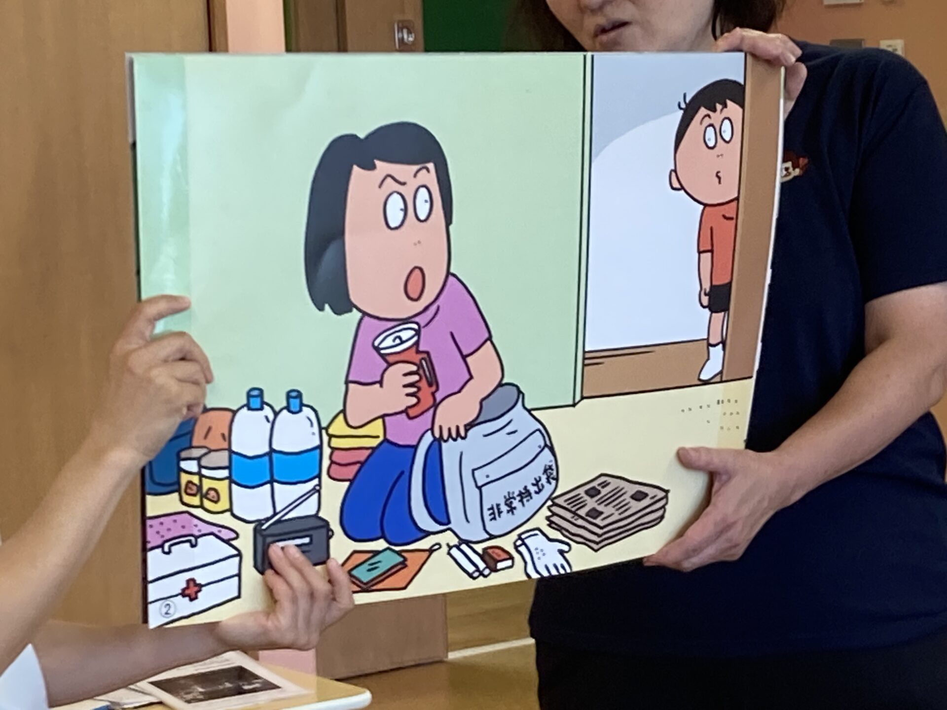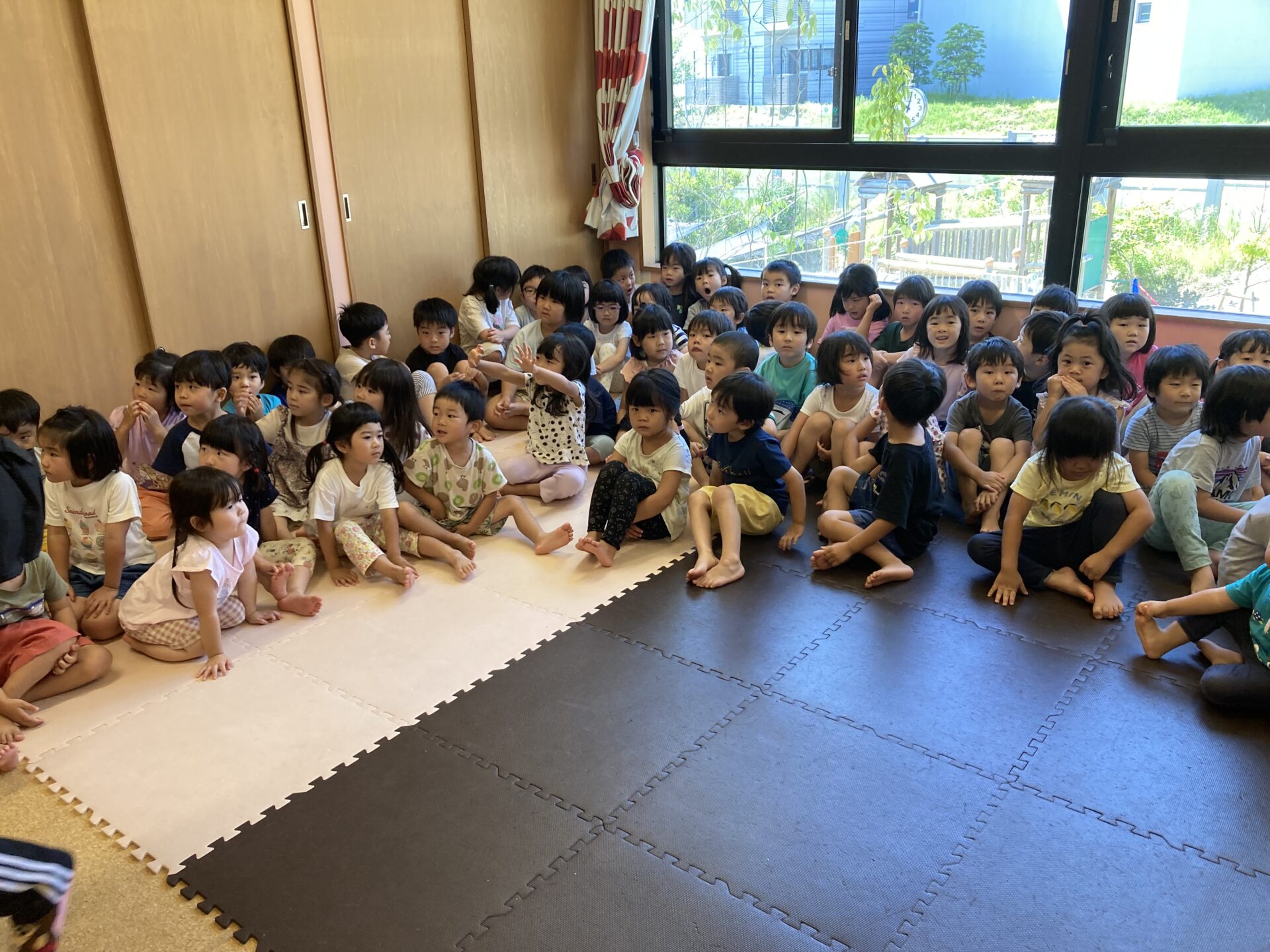 にじ組の部屋には、2階の園児たちが既に集まって避難しています。騒ぐことなく先生の話を待っています。そして今日は紙芝居を使って台風がきた時にどうしたらいいかのお話がありました。