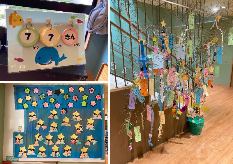 今日は7月7日、七夕です。壁面には織姫と彦星が仲良く並んでいます。今朝まで1階の階段下に設置されていた笹竹に、みんなが思い思いの願い事を書いた短冊をくくりつけてくれてます。