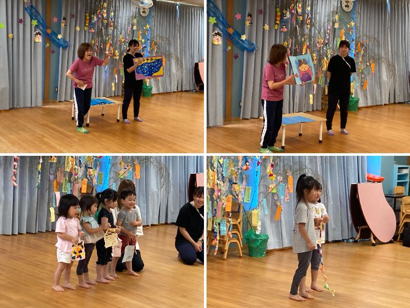 そら・くじらの部屋にみんなで集まって七夕会を楽しみました。先生が紙芝居で七夕のお話をしてくれ、そのあとは各クラス代表のお友だちが前に出てきて、クラスで作った飾りの説明をしてくれました。それぞれのクラスが想いを込めた飾りを作ってくれたようです。