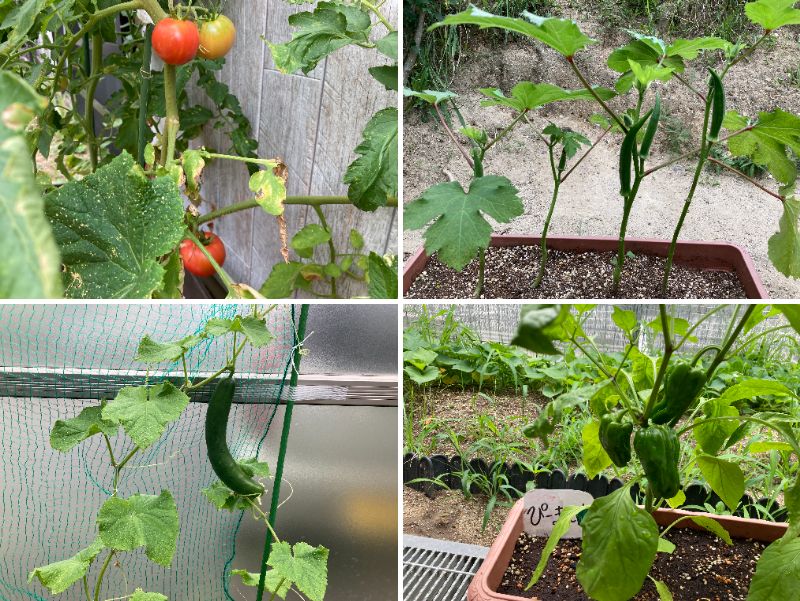 園庭の野菜たちが、ぐんぐん成長しています。ピーマン、なすび、トマト、オクラ、きゅうりと、しっかり育って収穫の時期を迎えています。