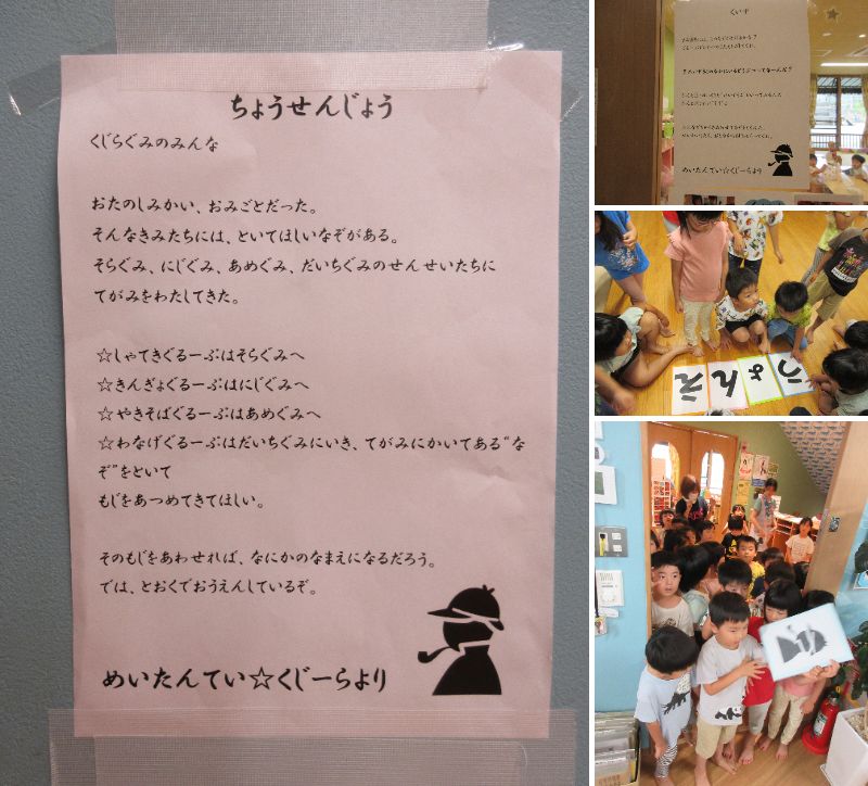 そしてお昼寝が終わると、くじら組の前に謎の人物「めいたんてい☆くじーら」からの挑戦状が落ちていました。そこには「なぞをといてもじをあつめてきてほしい」と書いてあります。みんなで考えて答えを出して正解したら文字が書かれたボードをもらいました。もらったボードを並べてみると・・・「ちうえょん???」「ちょうえん???」「あー、えんちょうだ!」と気付きました。これだけでも楽しくてわくわくしているくじら組のみんなでしたが、くじら組の代表のお友だちが園長にめいたんてい☆くじーらからのことを、それはそれは詳細にわたってしっかり伝えると、なんと園長のところにも何やら同じ絵柄の封筒が届いていました!子どもたちは大興奮です。「わたしの”なぞ”をとき、もじをあつめられたのだな。くじらぐみ、すごいぞ!!おみごとだった!!おたからをえんていにかくしておいた。うけとってほしい。うけとるためのじゅうようあいてむ:ぼうし・くつした・くつ・ゆうき」とありました。みんなで急いで部屋へ戻って重要アイテムを持って園庭へと急ぎます。