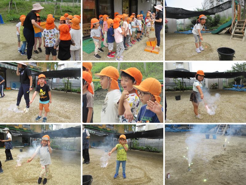 園庭に出ると砂場のところにお宝箱が置いてありました。お宝箱を開けるとその中には花火と手紙が!手紙には「しょうぼうしから、はなびのあんぜんなつかいかたをきみたちはきいているか?」と書いてありましたが、これには全員「このまえ、消防士さんから聞いた!」の大きな声。そう、先月に吹田市の消防士さんが来てくれて花火体験をやったところでしたので、みんな自信をもって答えていました。
