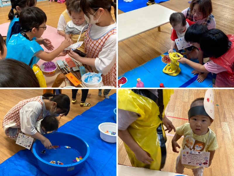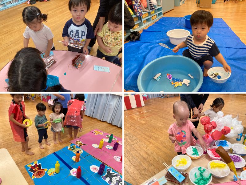 9時30分になると、まずうみ組(0歳)のお友だちがやってきました。回ったお店で押してもらうスタンプカードにも優しくスタンプを押してくれたり、わなげをサポートしてくれたりと、優しいお兄さん、お姉さんぶりを発揮していました。きっとそんな空気が伝わったのか、うみ組のお友だちは泣くこともなく楽しんでいたように感じました。
