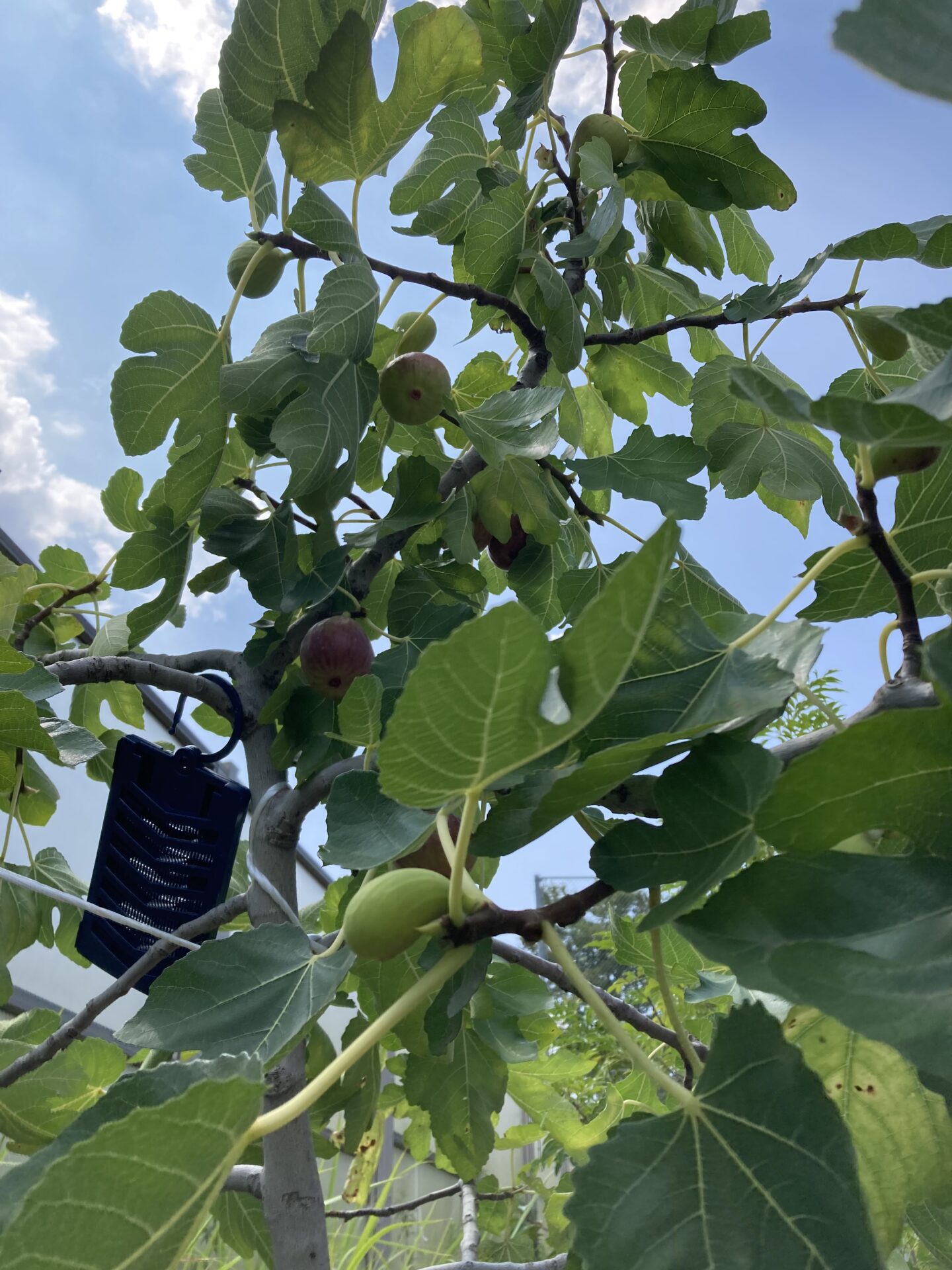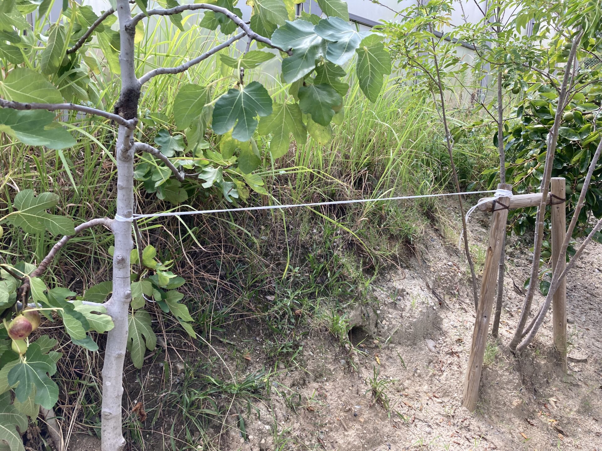 実は先日の台風7号の影響で、いちじくの木が倒れてしまっていました。何とか隣の柿の木用の支柱と紐で繋いで何とか持ちこたえてくれています。まだ実がついていますので、もう少し収穫を楽しめそうです。