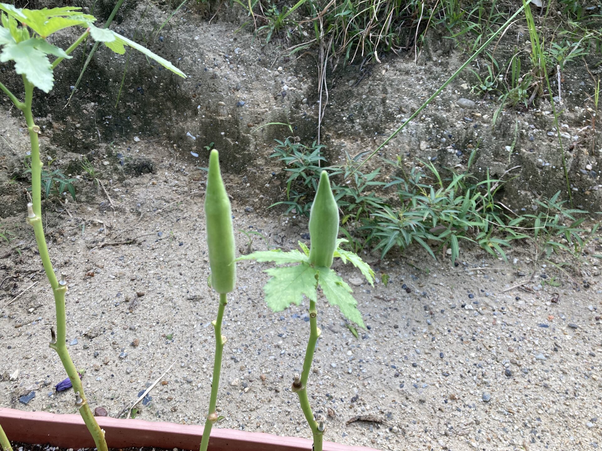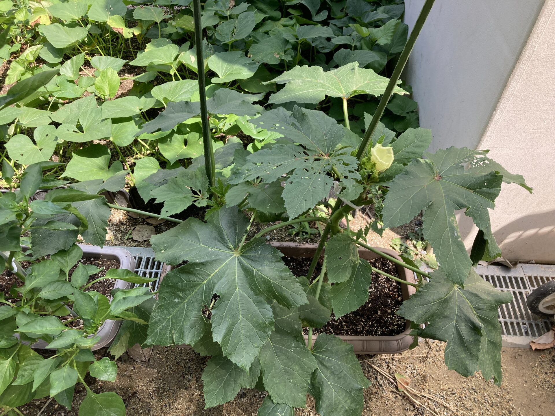 原産地アフリカと言われている暑さに強いオクラは元気に花を咲かせたり実を付けてくれています。