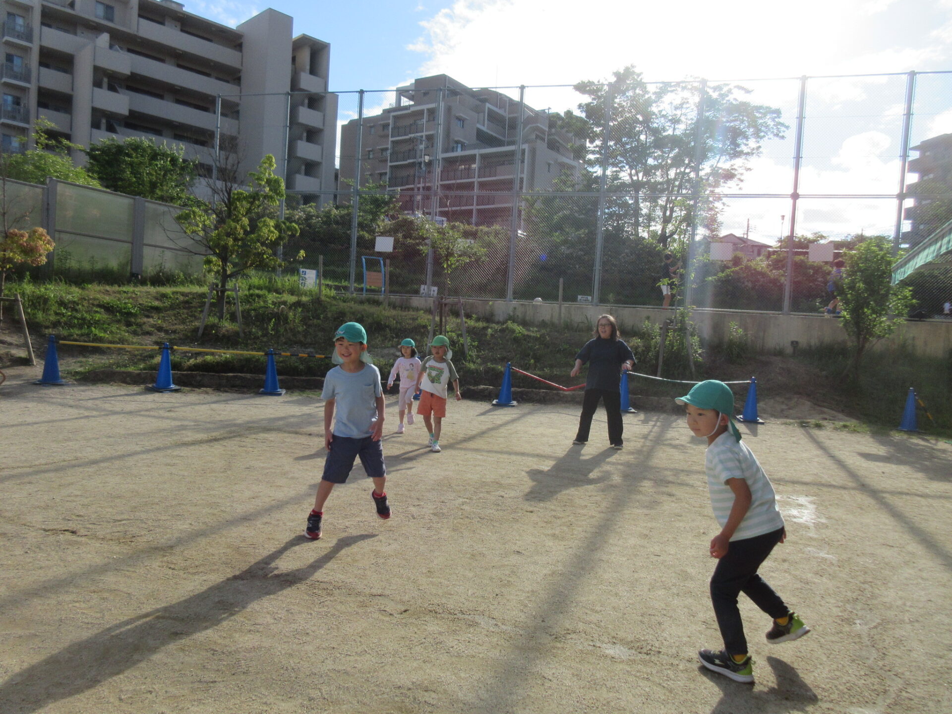 先生と園庭で遊ぶくじら組(5歳児)を