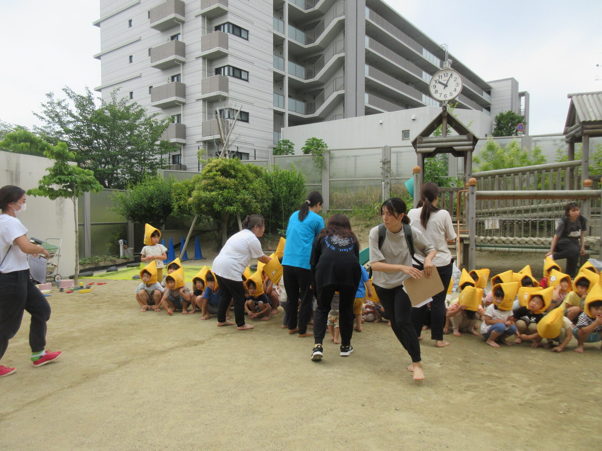子どもたちを園庭に